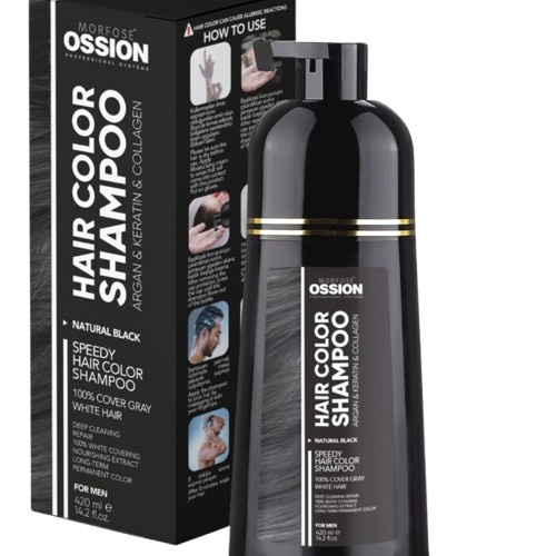 El Hair Color Shampoo Negro con Argán & Keratina OSSION es un champú colorante negro diseñado especialmente para hombres que buscan cubrir las canas de forma rápida, eficaz y profesional. Ideal como champú negro para hombre en barbería o uso doméstico, combina coloración permanente y tratamiento capilar en un solo paso.
